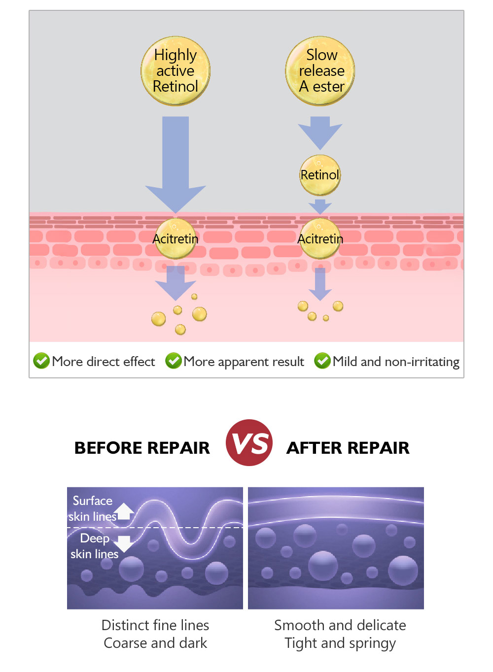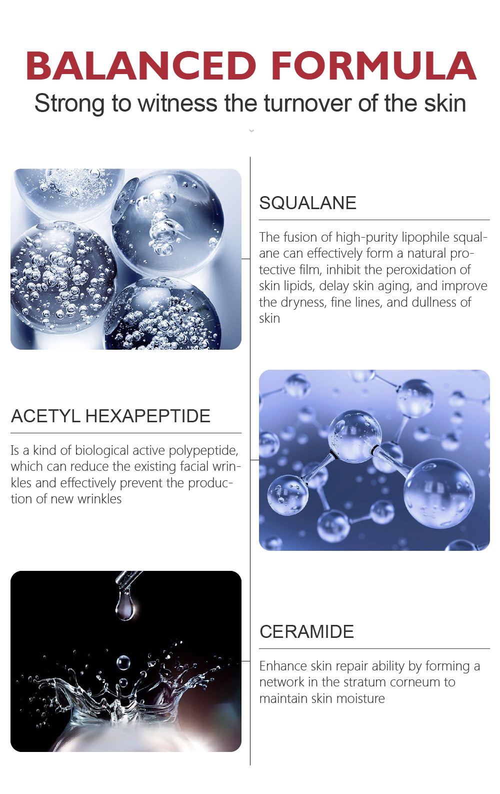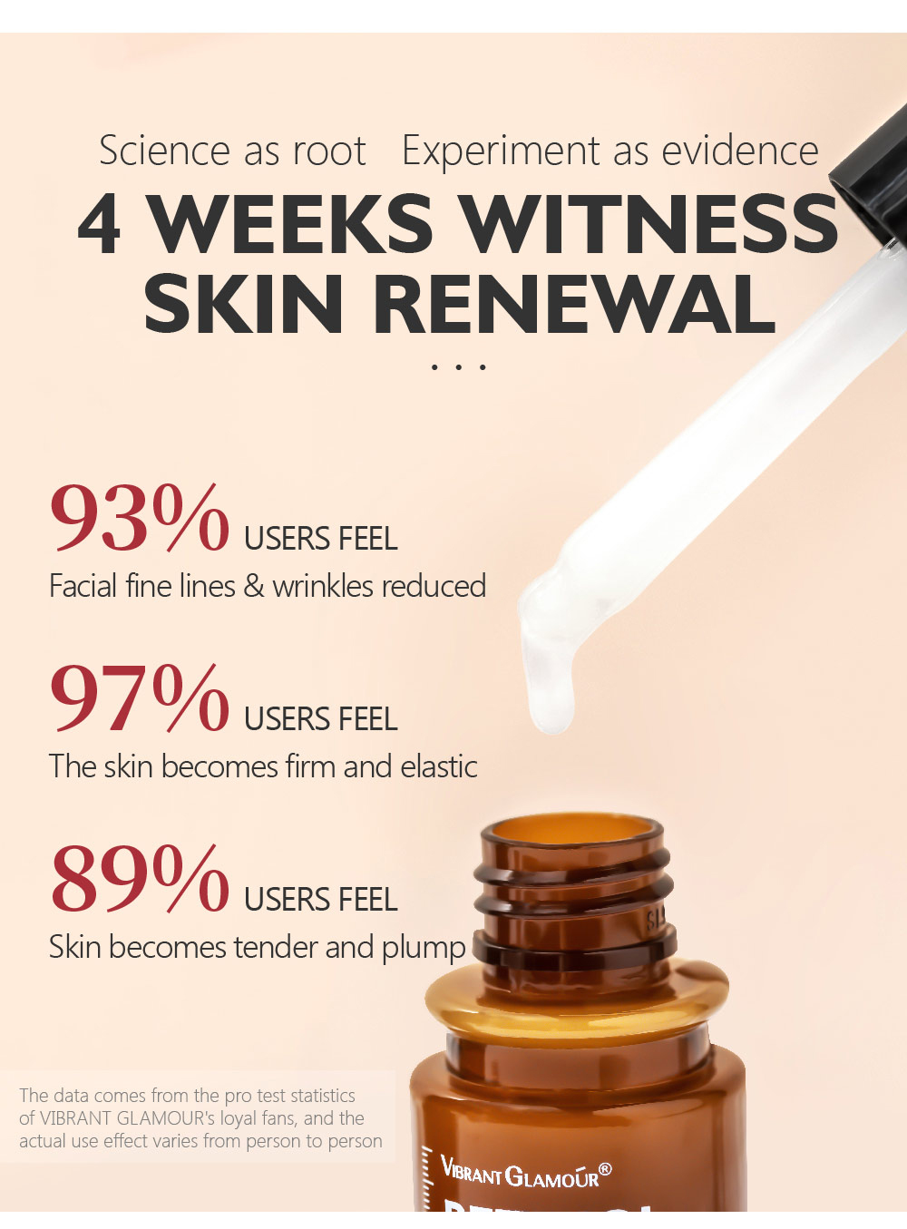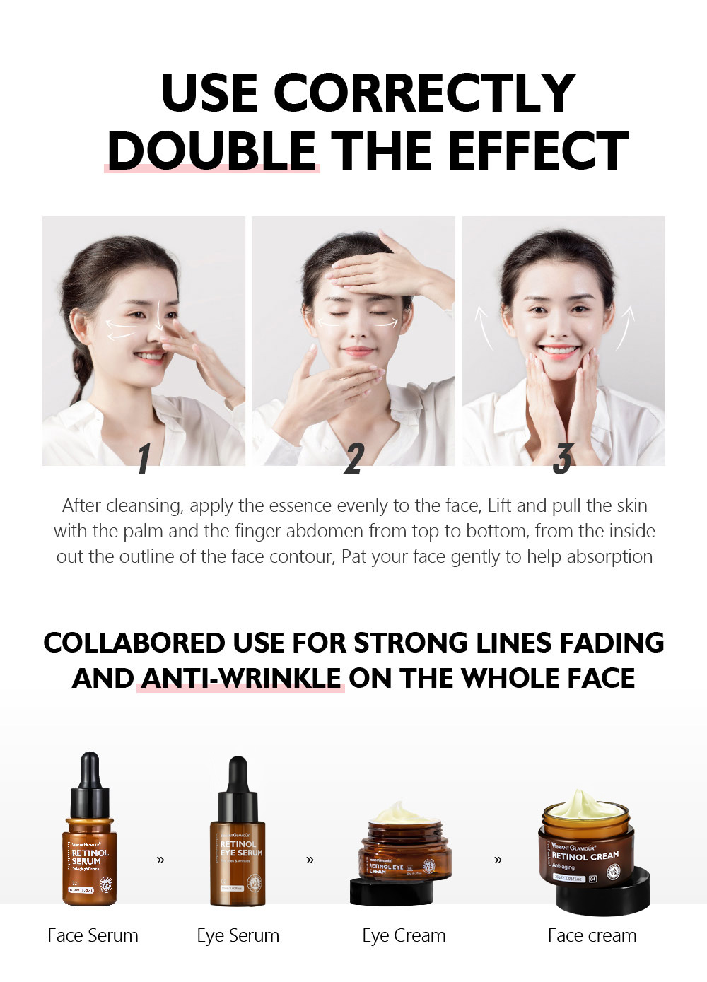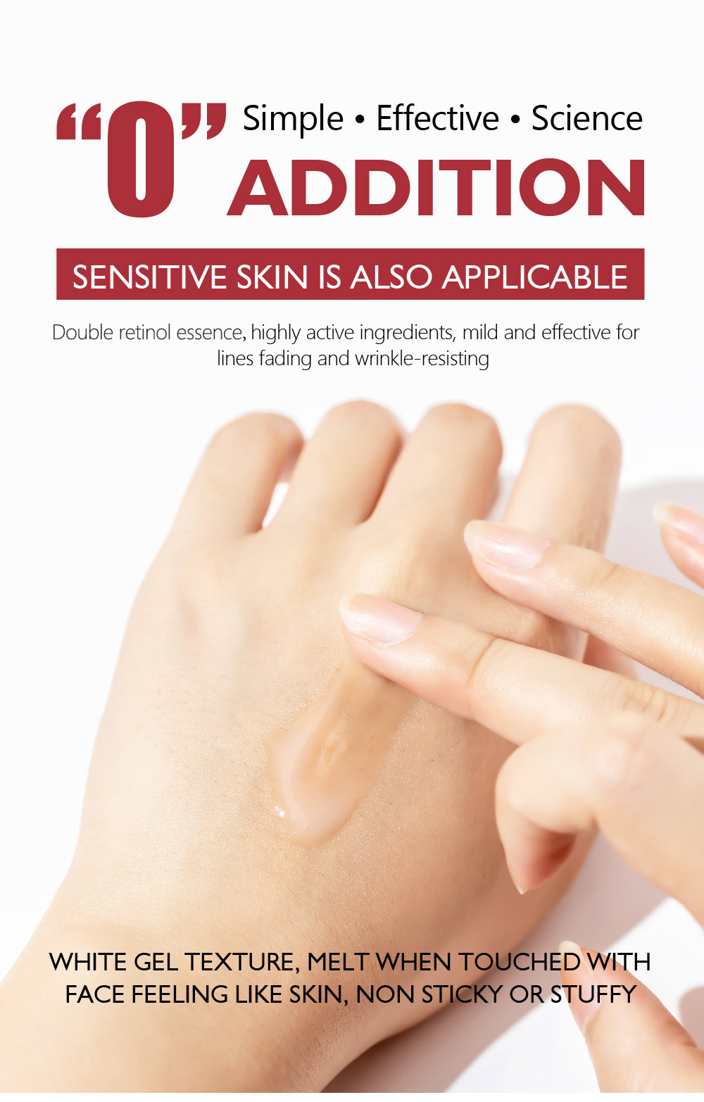 Double Retinol, clear superoxide free radicals, can not only reverse photoaging, accelerate skin self-renewal, inhibit the formation of wrinkles, promote collagen synthesis, fade fine lines, help the corneous layer update and brighten skin tone for delicate and firm skin